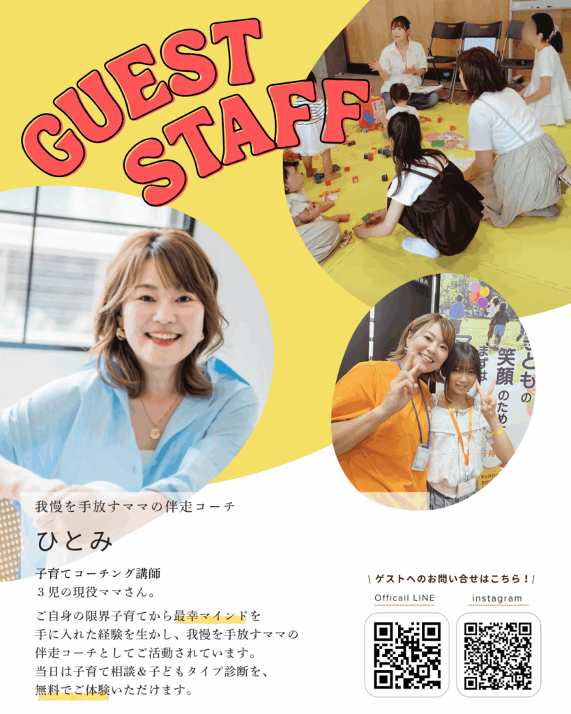 ▲10/26(日)ゲストスタッフとして【子育てコーチング講師・ひとみさん】が参加!今回はひとみさんの「ママパパの力になりたい!」という同じ育児戦士として想いあってのご参加です。セミナー型ではなく個別相談型ですので、気軽に日々のあれこれをお話しいただけます♪